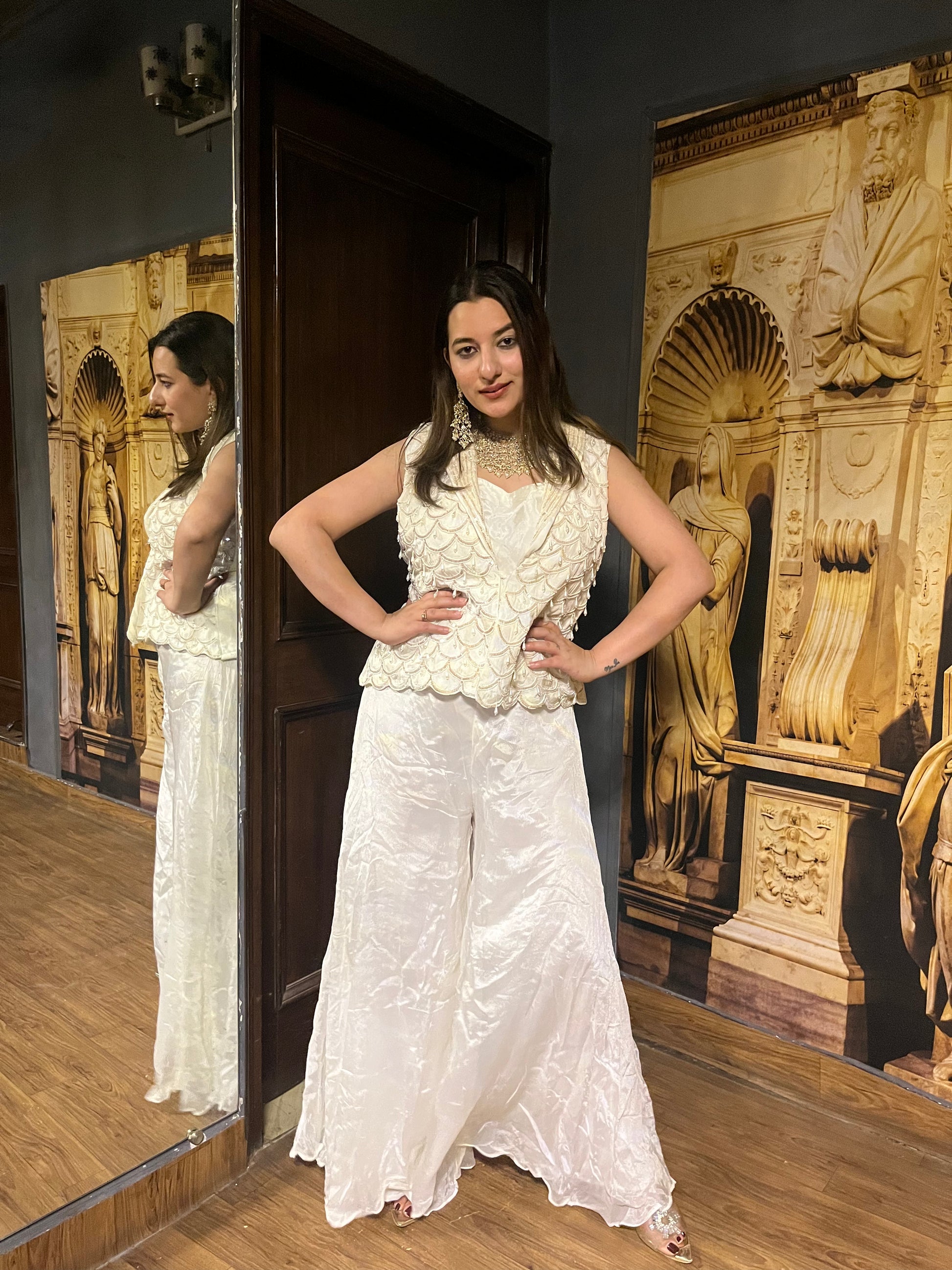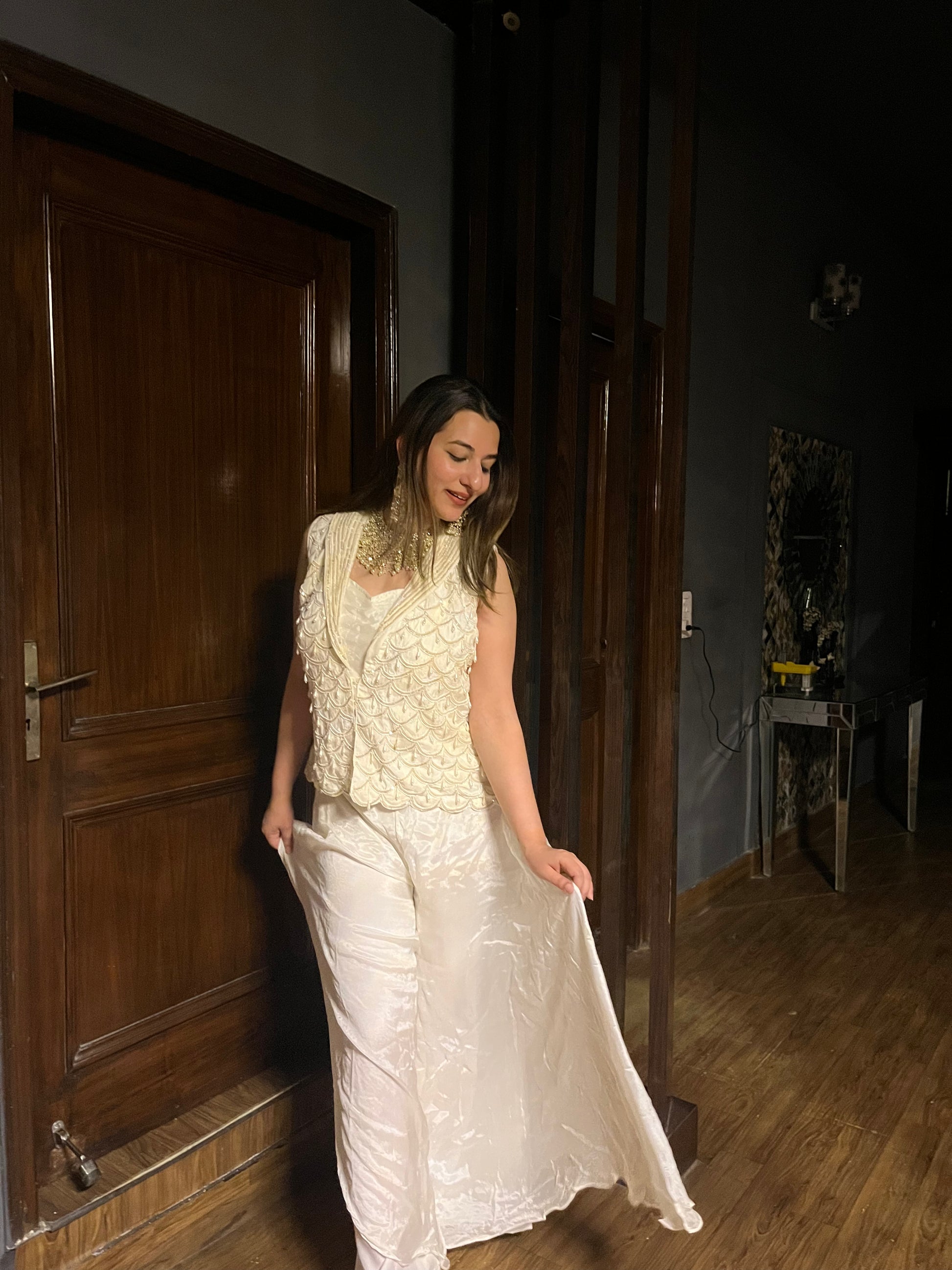 Inspired by the endless beauty of the sky, Aasma is an ivory dream brought to life. It flows effortlessly with every step. The subtle shimmer of Cutdana and Sequin embroidery adds a celestial glow, making it perfect for moments that call for understated glamour. A timeless piece designed for the modern woman who values grace and individuality.