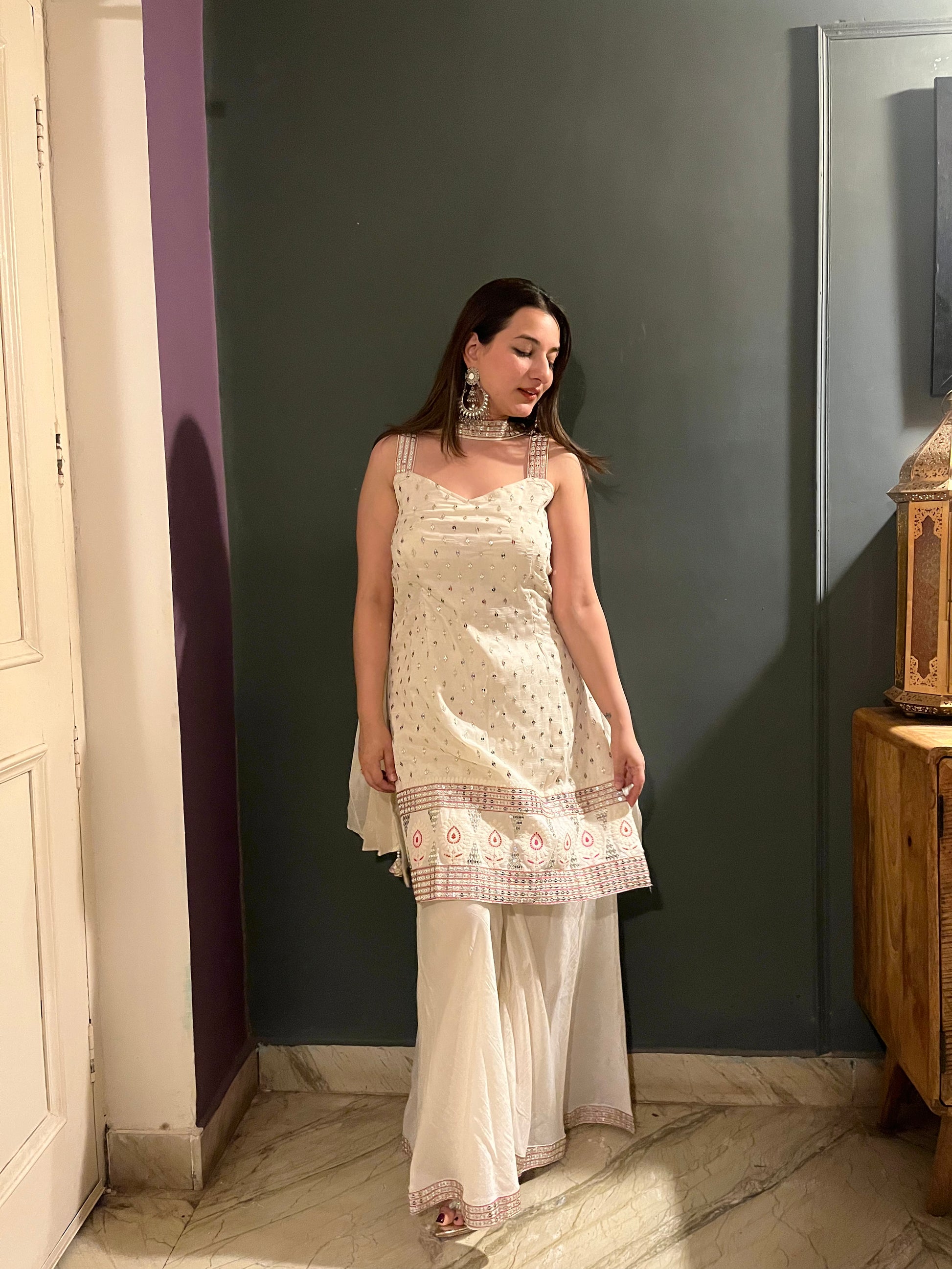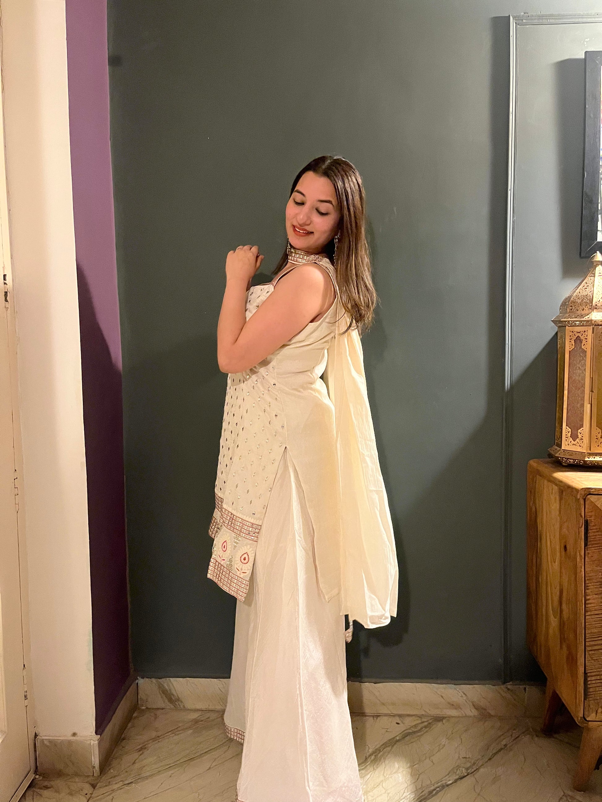 Falak is a vision of celestial grace, rendered in soft, cloud-like hues that radiate calm sophistication. This flowing silhouette is adorned with delicate beadwork and shimmering sequin detailing that catch the light with every move. Lightweight yet regal, it’s perfect for festive gatherings, evening affairs, or any moment where you wish to rise above the ordinary.