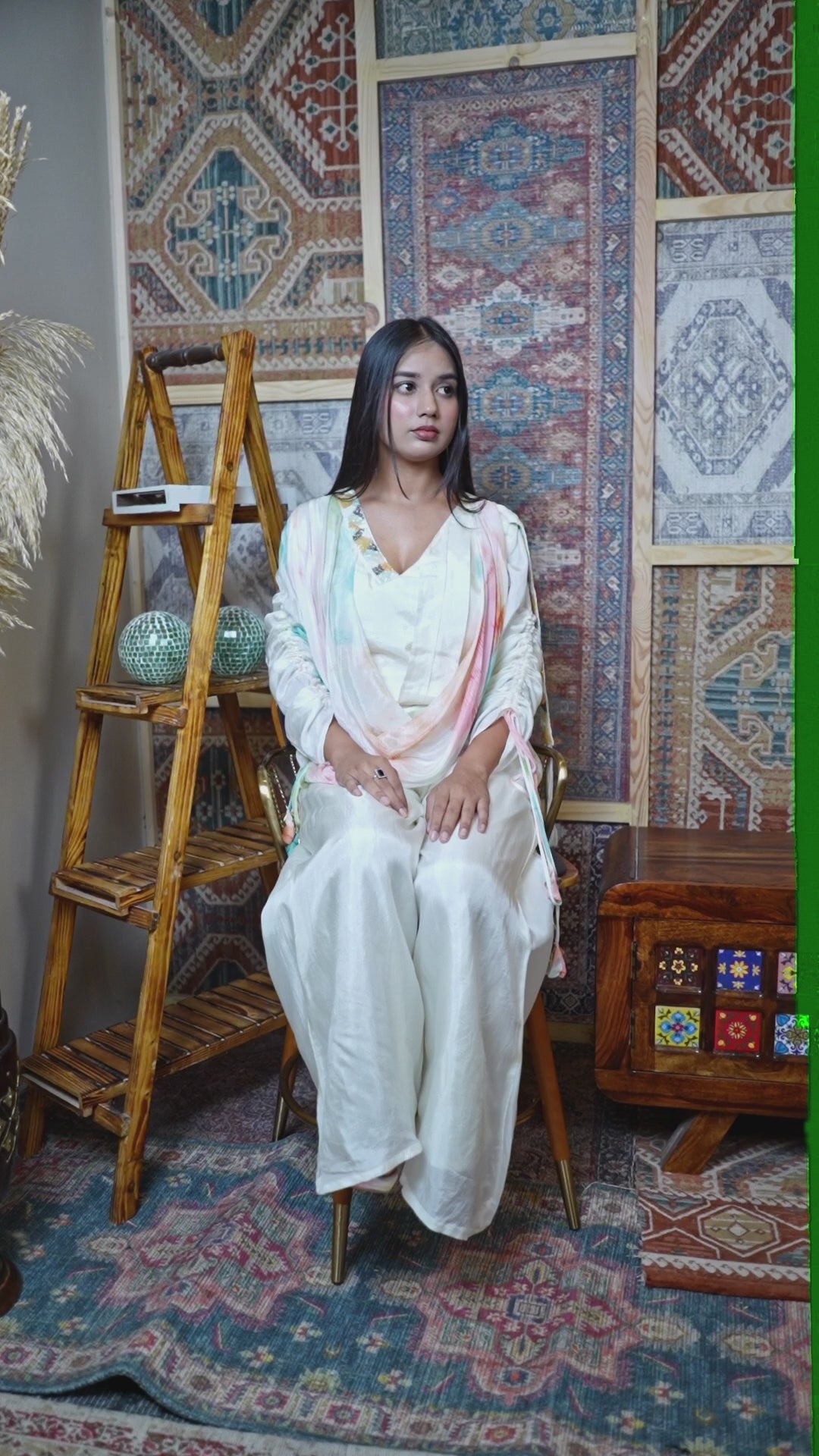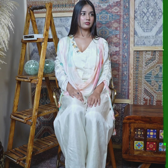 This ivory co-ord set flows like a dream, inspired by the softness of marble and made in luxe Upada and Chinnon fabrics. The delicate Cutdana and sequin detailing catches light with every step—subtle, yet unforgettable. For the woman who shines quietly, this one’s for your most effortless moments of elegance.