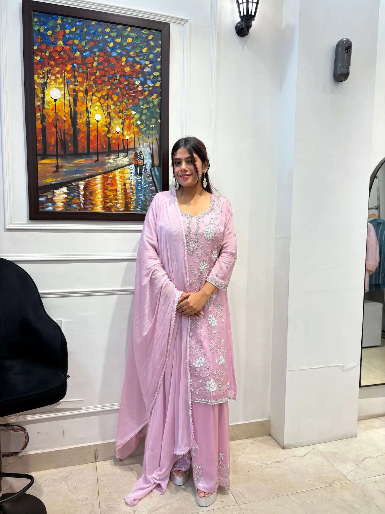 A mauve embroidered straight kurta with intricate silver thread, sequin, and floral zari work, paired with a flared sharara and a light, drapey dupatta.