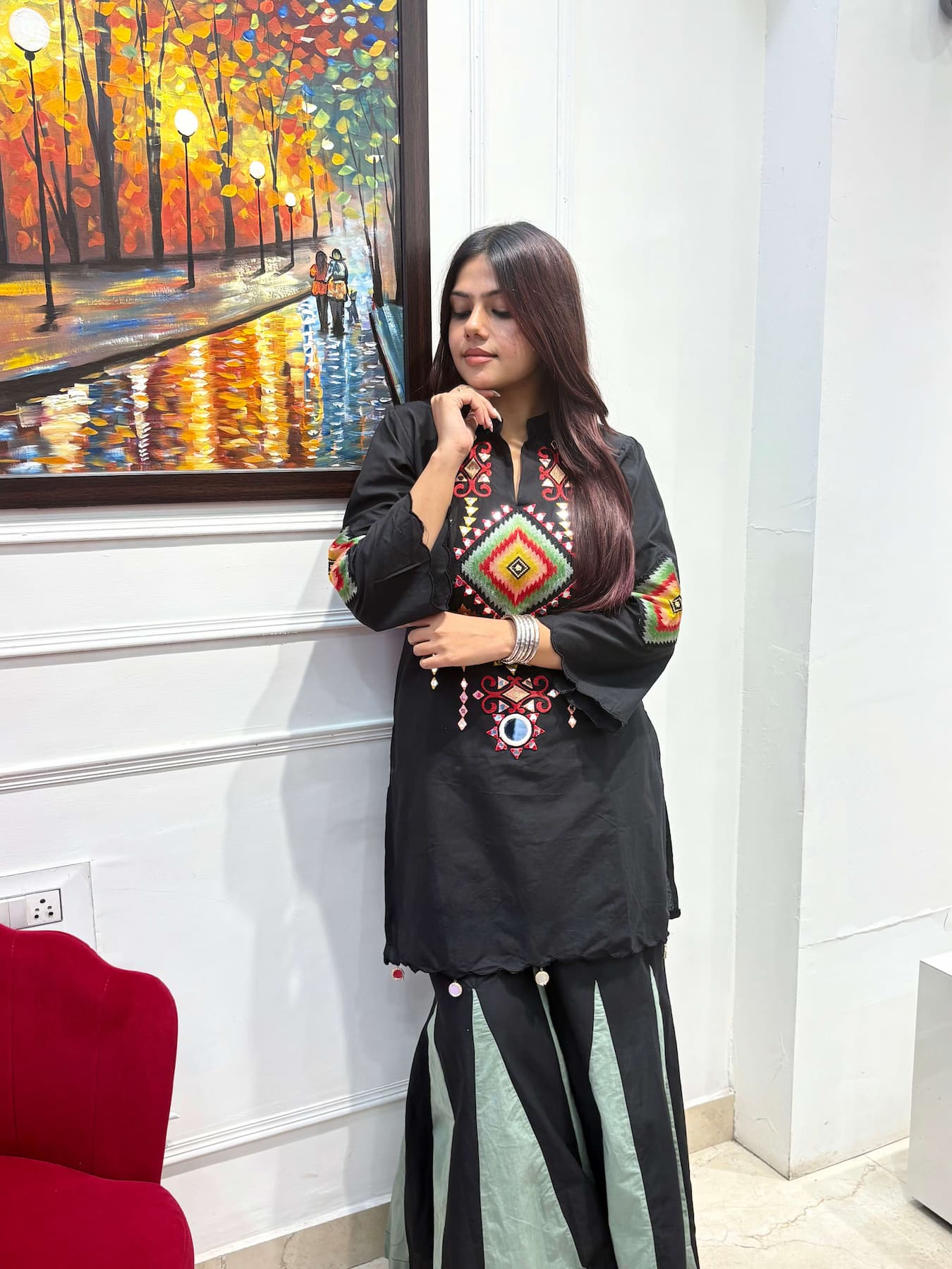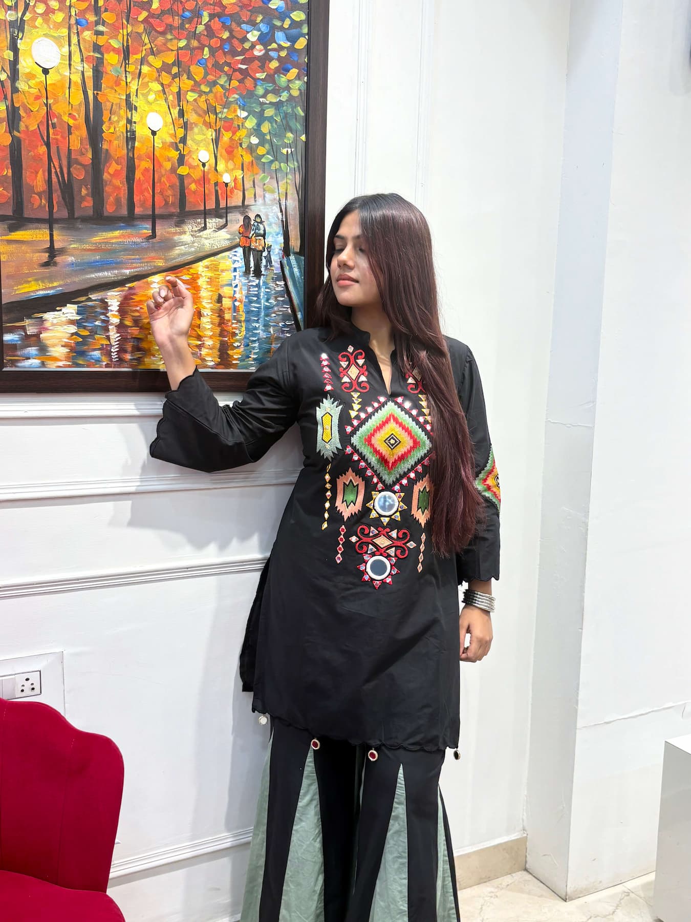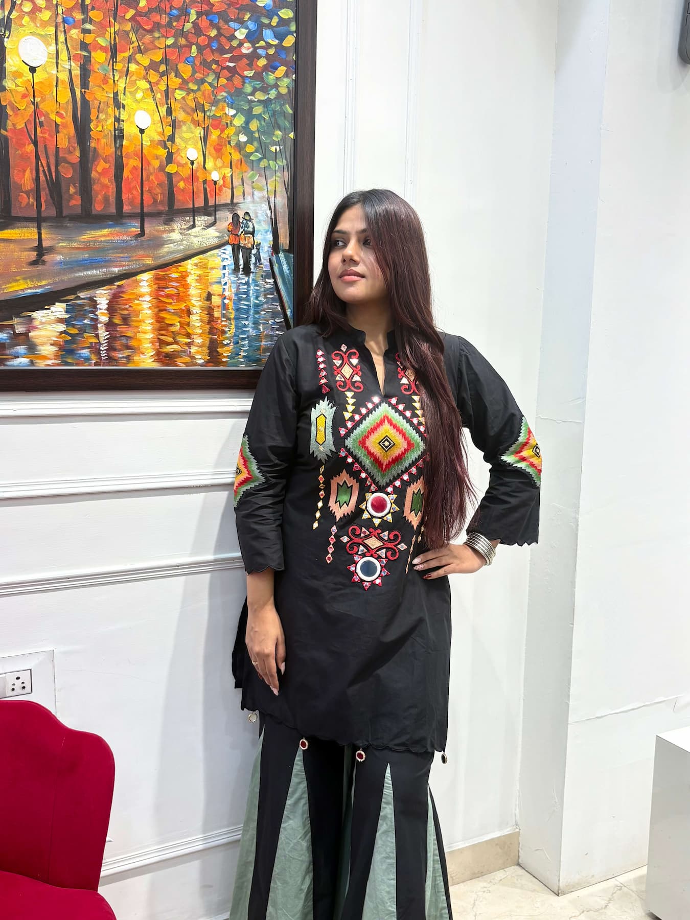 Make a statement in bold black ✨ The “Maya” co-ord set elevates your look with vibrant geometric embroidery and playful mirror accents on soft cotton. Effortlessly chic and comfortable—perfect for celebrations, evenings out, or adding flair to any day.