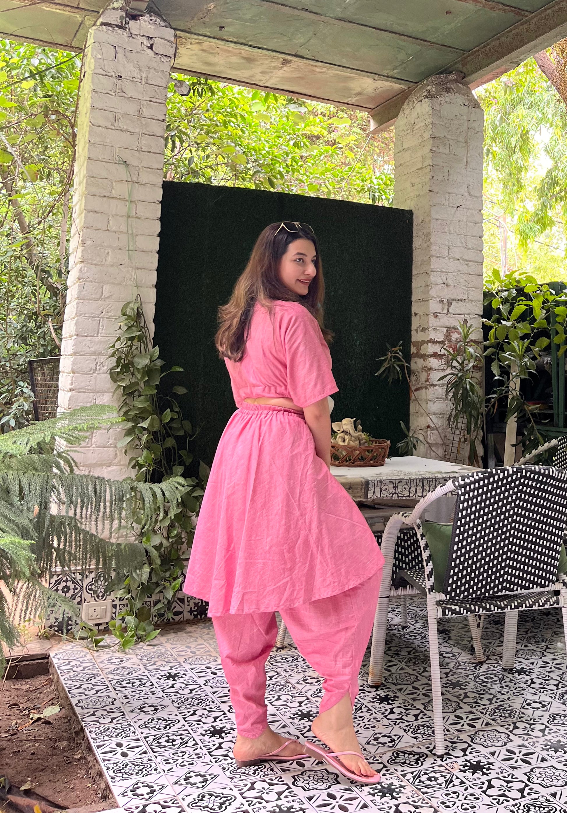 Turn heads this summer with this stylish Co-ord Set - your go-to vacation outfit designed for sun-soaked days and breezy escapes. Crafted from a breathable cotton-linen blend, this set keeps you cool while serving effortless elegance. The pleated V-neck crop top features flowy sleeves and a flattering wrap silhouette, making it as airy as it is eye-catching. Paired with layered cowl pants that drape gracefully, the set offers a chic fusion of comfort and structure - ideal for brunches, strolls, or beachside cafés.