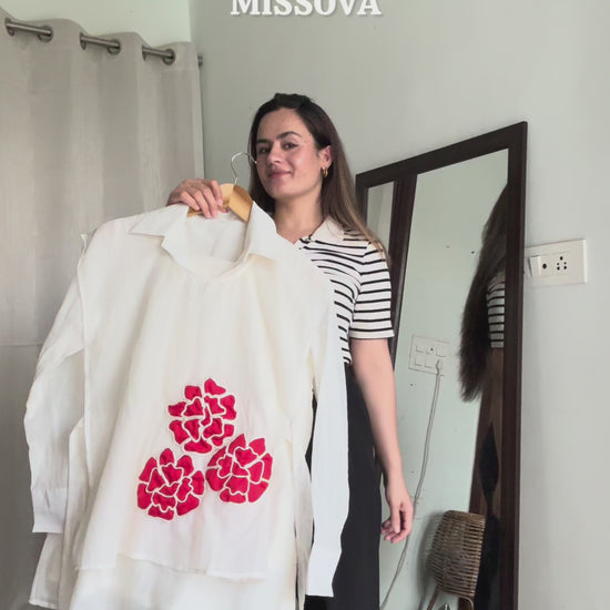 - Bell-bottom pants with rich floral appliqué & mul lining