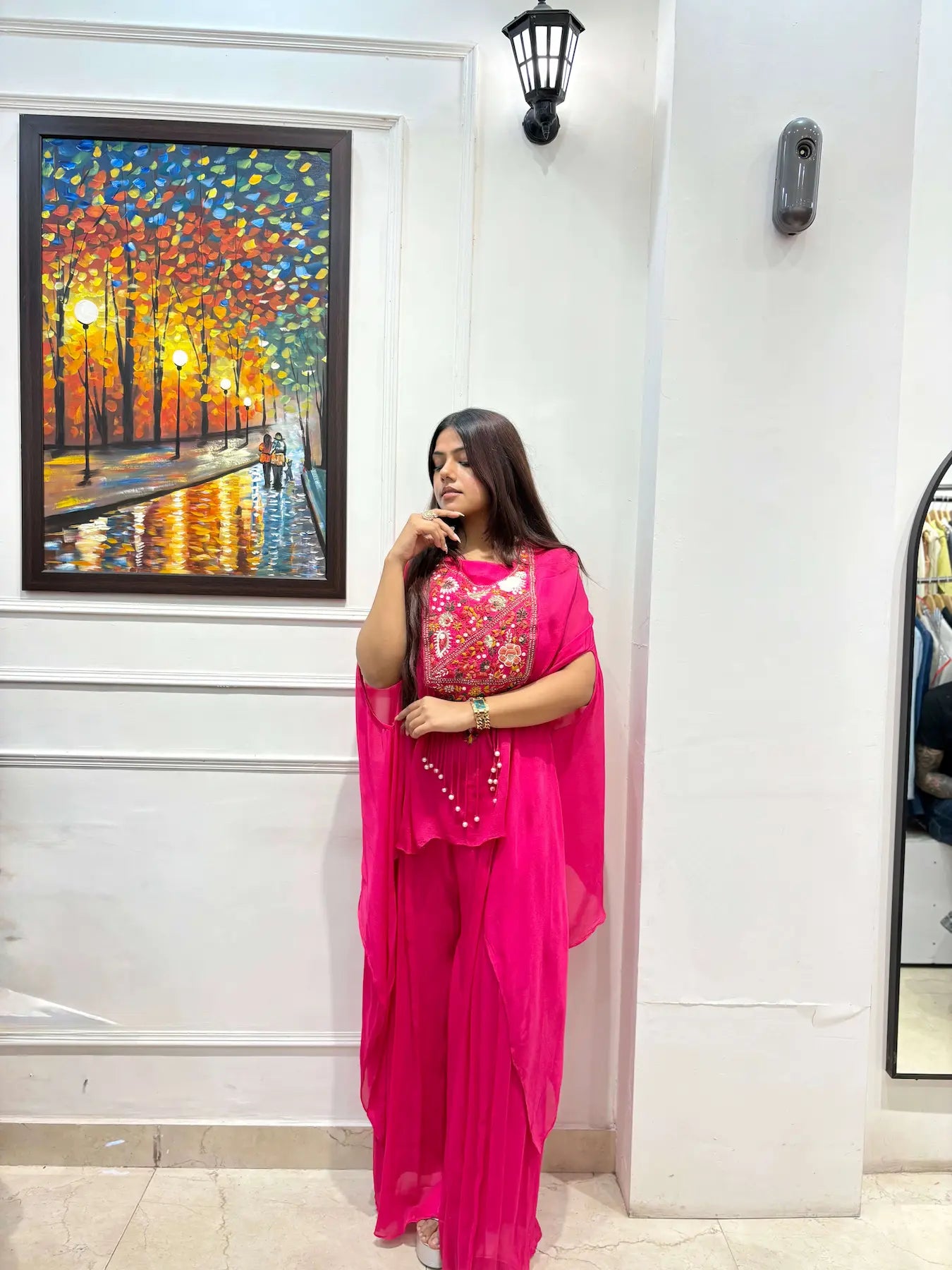 A vibrant hot pink cape cord set adorned with intricate embroidered work on the yoke, finished with delicate pearl tassels that add grace and charm to every move.