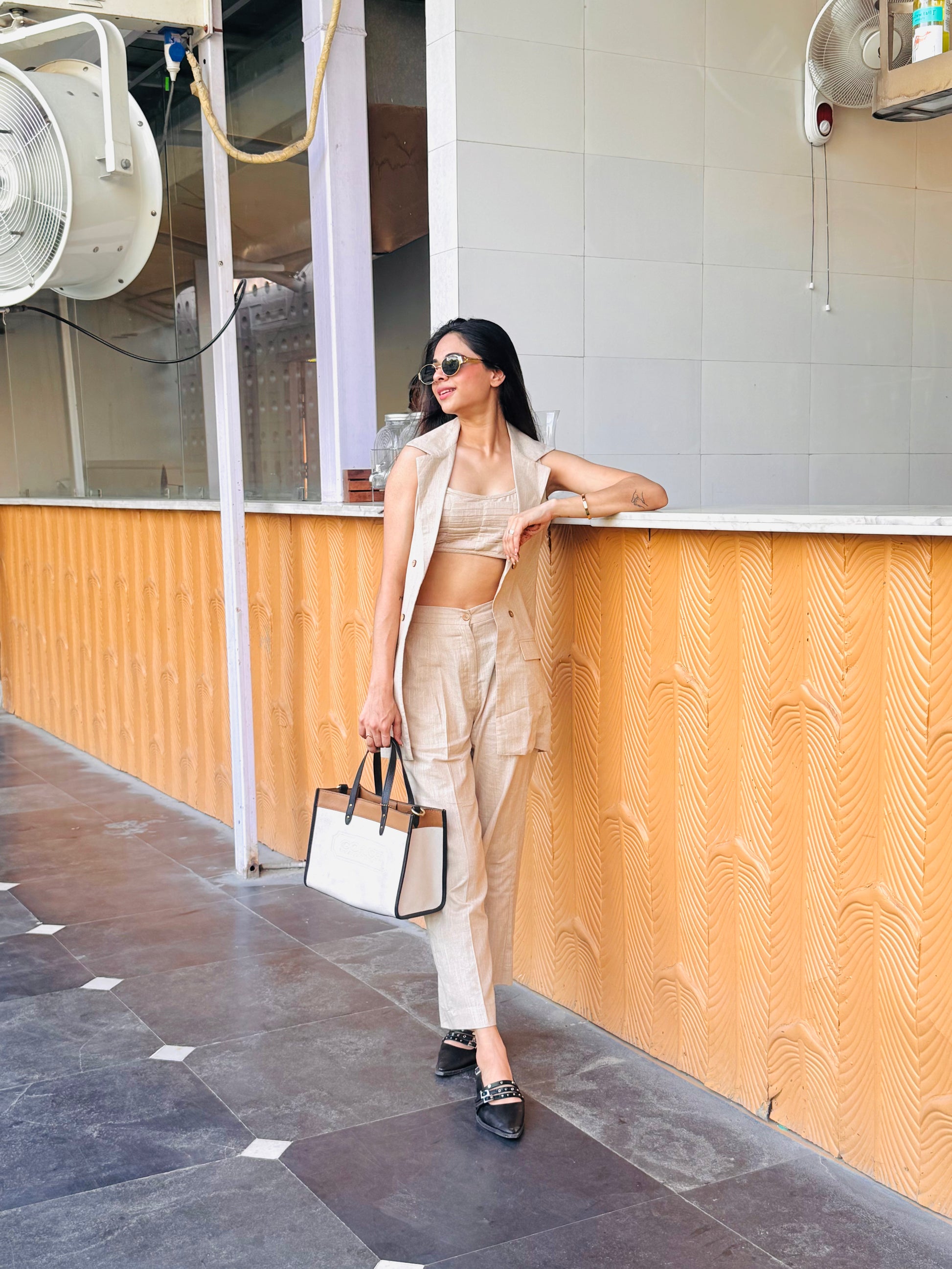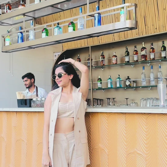 Meet your new power-luxe go-to. This 3-piece co-ord set in a soft premium cotton-linen blend is your ticket to minimal sophistication. It features high-waisted wide-leg trousers, a fitted crop top, and a sleeveless longline blazer—designed to keep it crisp yet carefree. Whether you’re stepping out for brunch or running the show at work, this look speaks quiet confidence—only at Missova.